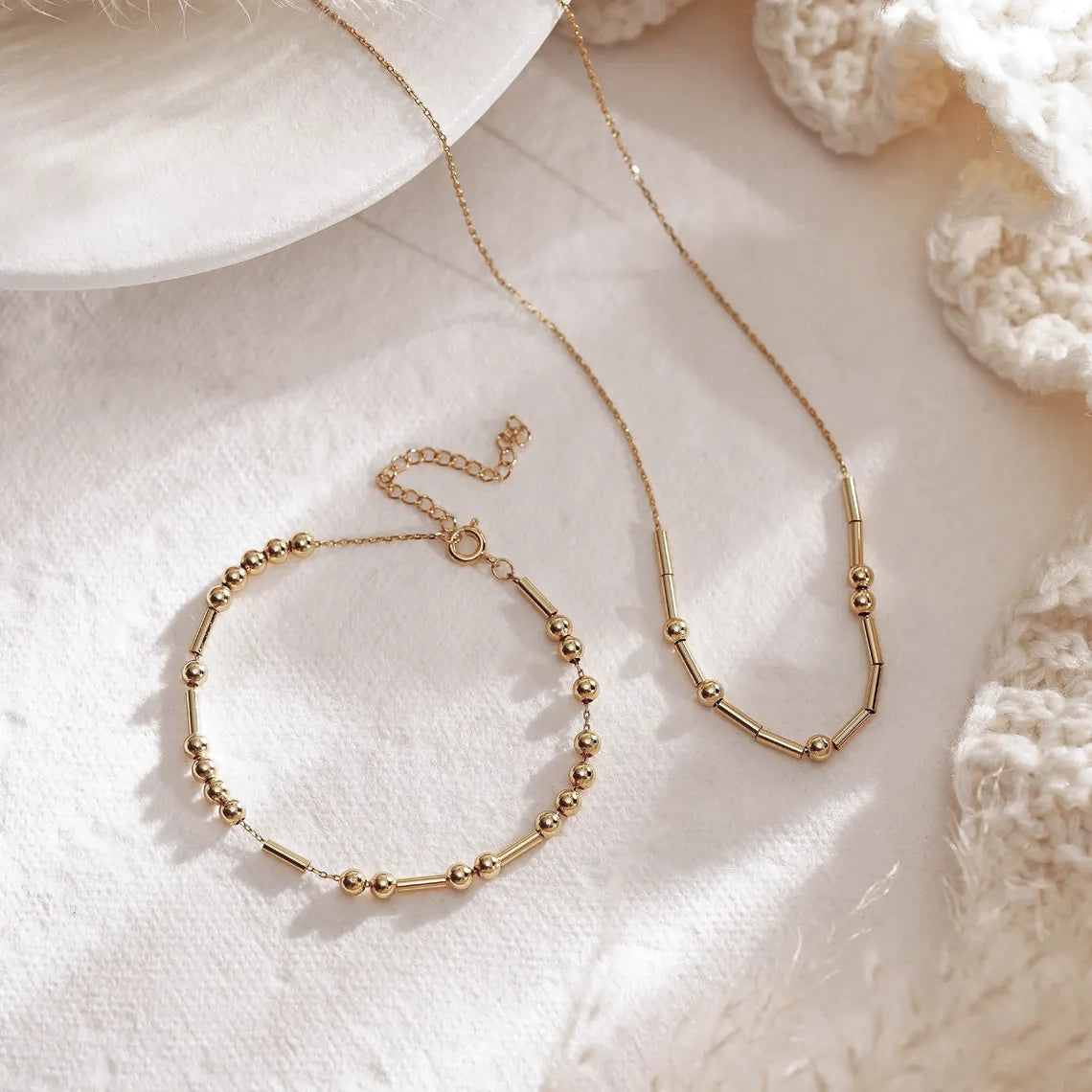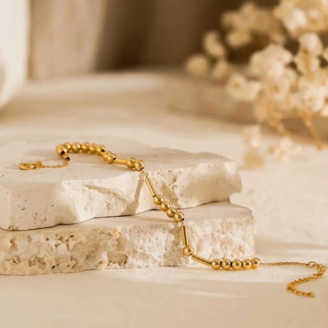 Delikatny łańcuszek typu "box" oraz złocone kulki pokryte 18-karatowym złotem w technologii PVD. Gwarantuje to wyjątkową odporność na ścieranie i niezmienny, głęboki połysk. Rdzeń wykonano ze szlachetnej stali chirurgicznej 316L.